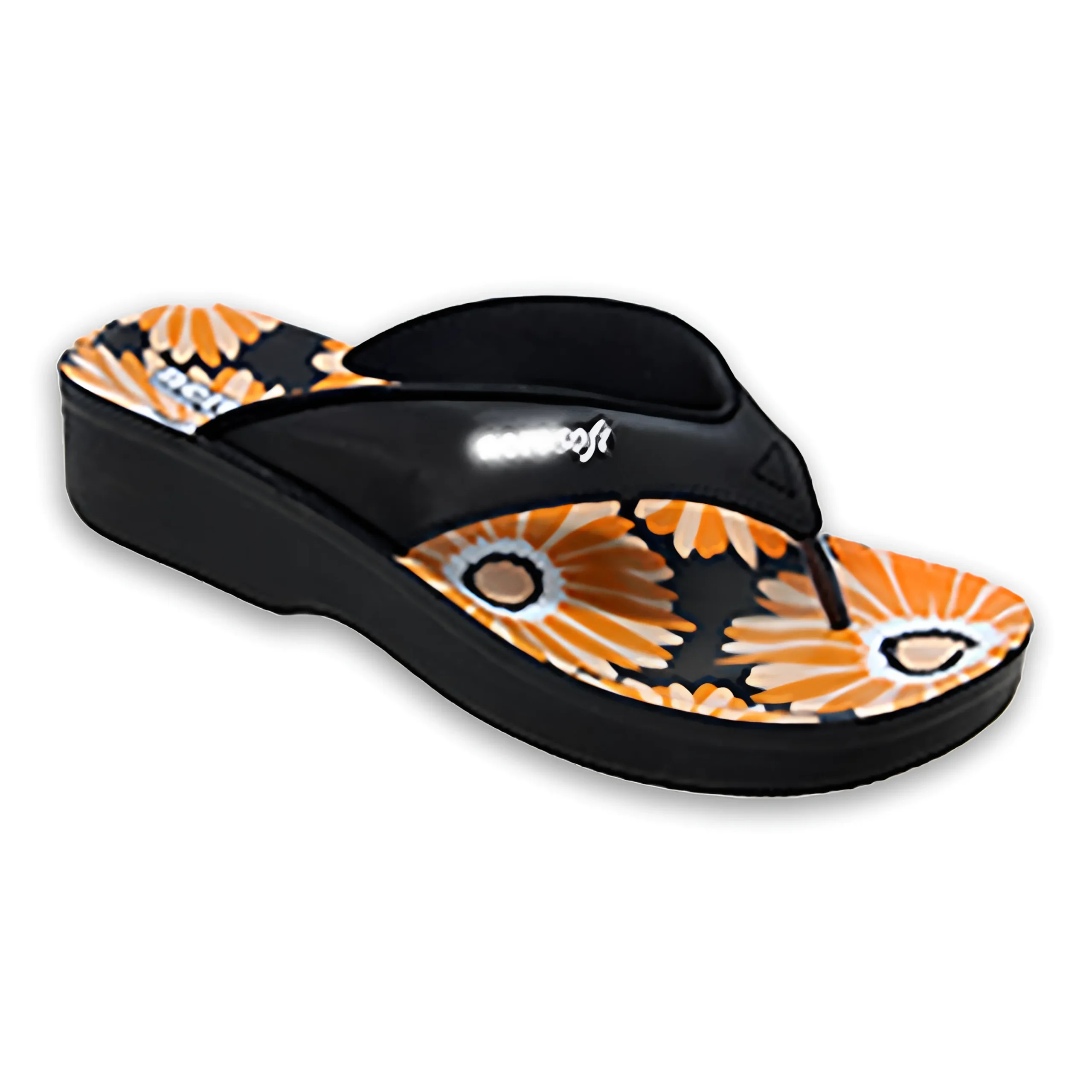 & Free ShippingElegant women’s wedge flip-flop featuring a glossy black strap with the Starsoft logo. The footbed is decorated with bright orange and white floral patterns that give it a fresh and stylish look. Designed with a lightweight wedge sole for added height and comfort, making it perfect for casual daily wear and summer outings. 👡🌼