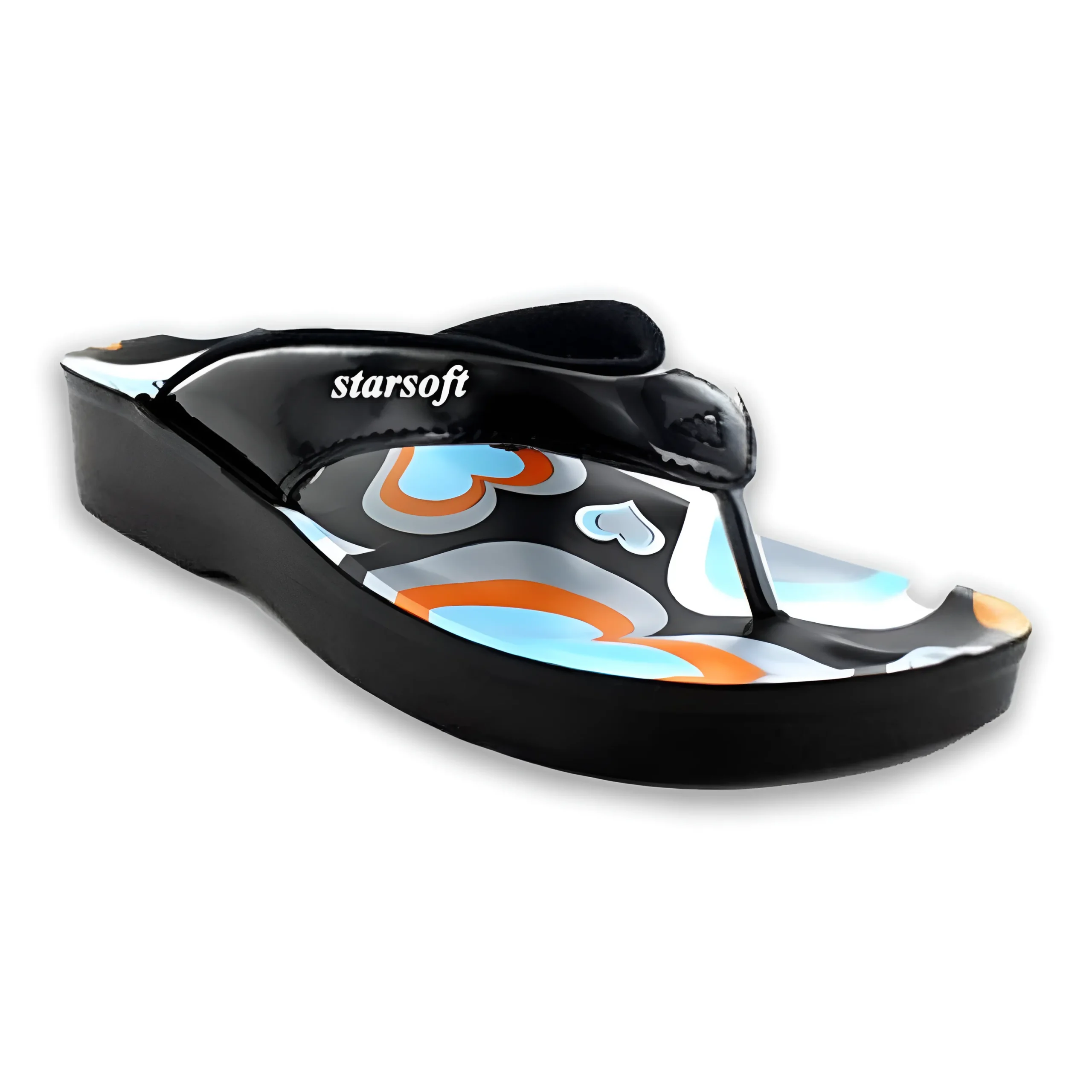 & Free ShippingStylish women’s wedge flip-flop by Starsoft featuring a glossy black strap with a comfortable toe-post design. The footbed showcases a modern heart pattern in soft blue, orange, and white tones, giving it a trendy and playful look. Built with a lightweight wedge sole for extra height and comfort, making it ideal for everyday casual wear. 👡❤️