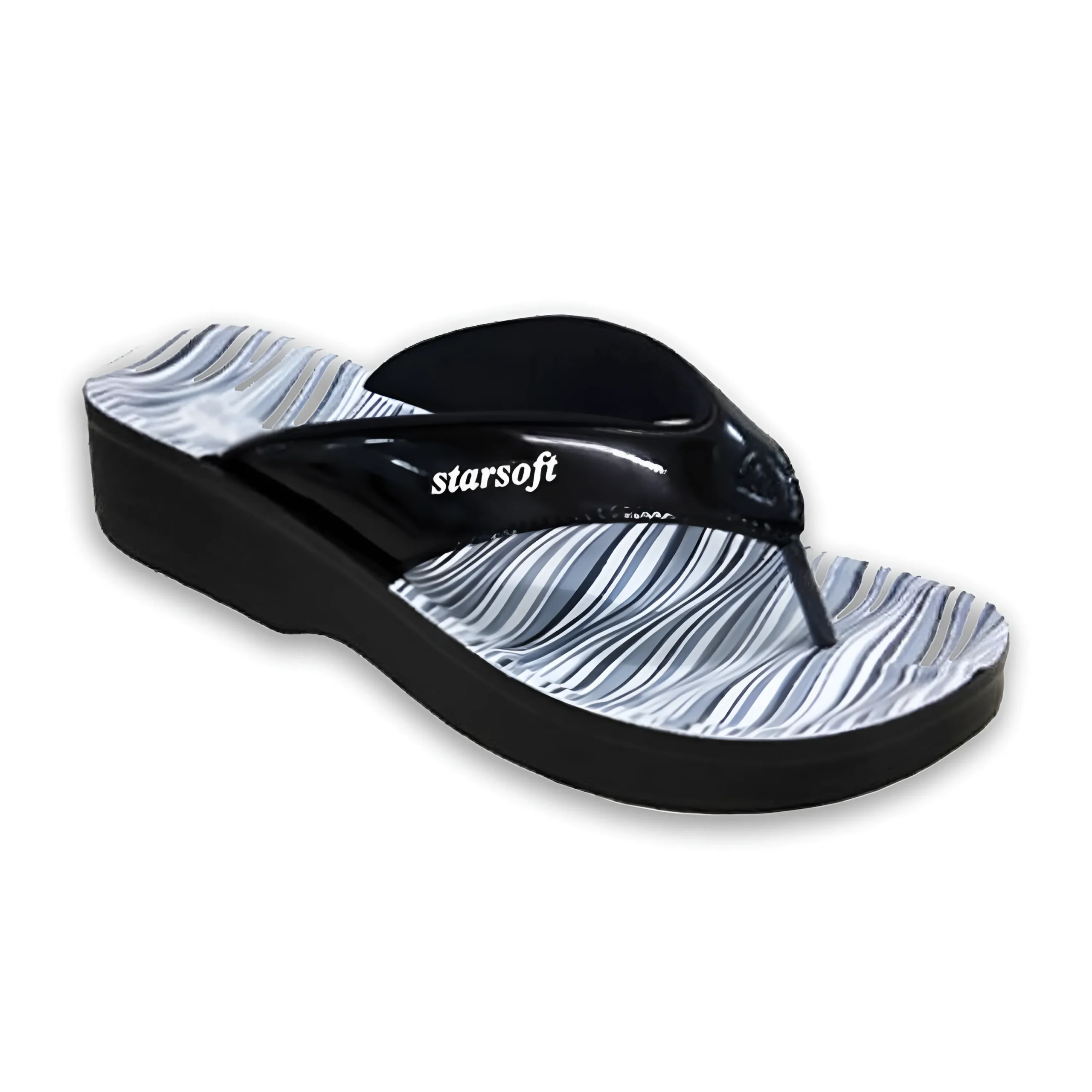 & Free ShippingStylish women’s Starsoft wedge flip-flop designed for everyday comfort and elegance. It features a glossy black strap with the Starsoft logo and a comfortable toe-post design. The cushioned footbed has a modern wave-pattern print in white and grey tones, giving it a sleek and fashionable look. The lightweight wedge sole provides gentle height and support, making it perfect for casual wear and daily outings. 👡✨