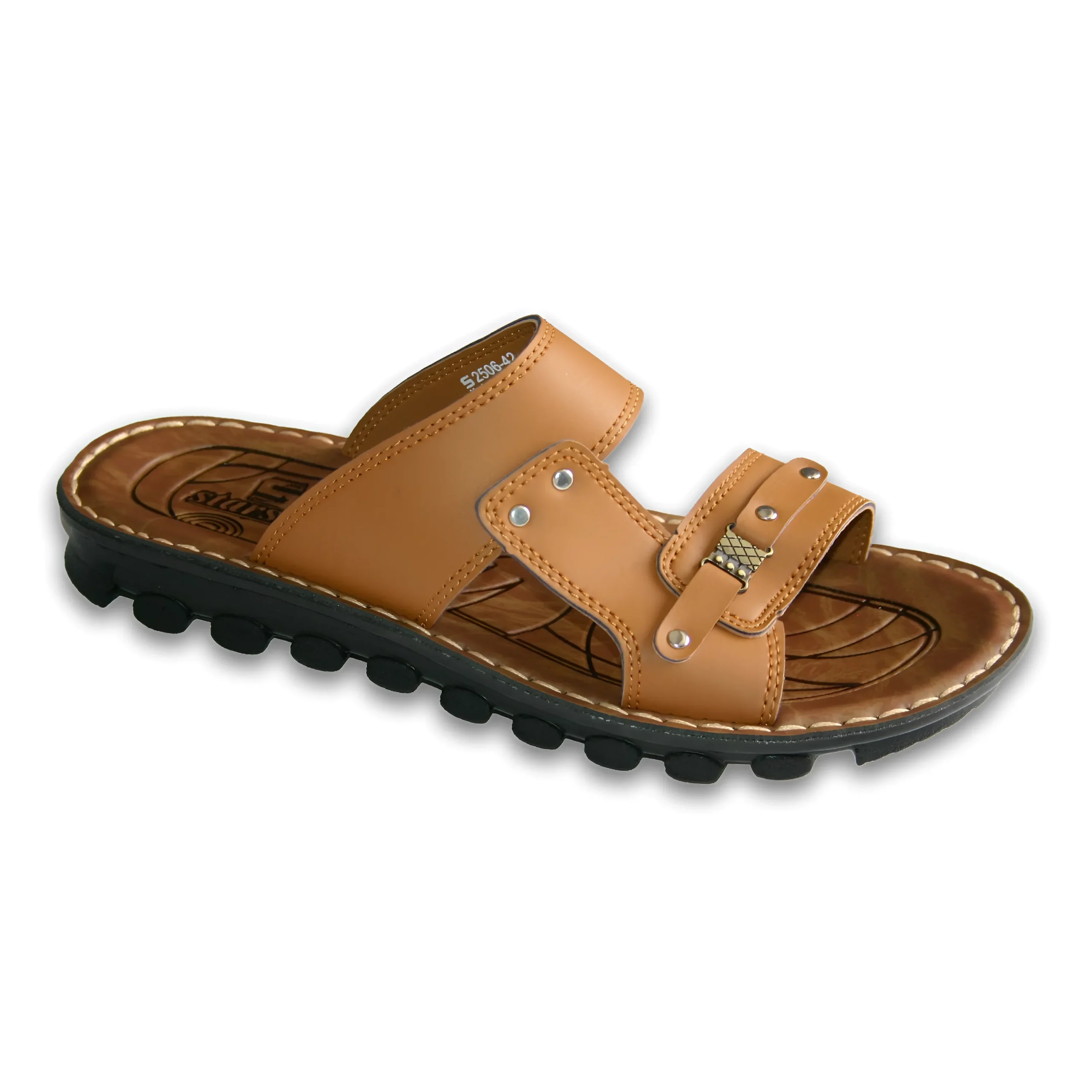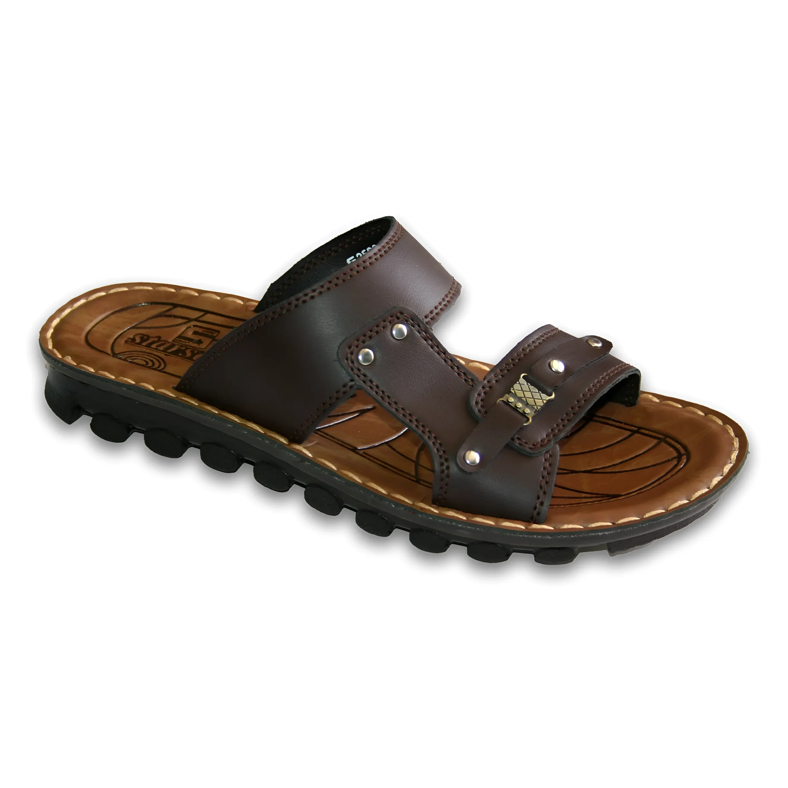 & Free ShippingTrendy men’s dual-strap sandal available in classic Black, rich Brown, and Tan finishes. Designed with a wide upper strap and an adjustable front strap accented with metallic studs and a stylish buckle detail for a bold look. The textured, cushioned footbed ensures superior comfort, while the rugged, anti-slip outsole provides excellent grip and durability. Perfect for casual outings, daily wear, and effortless everyday style.