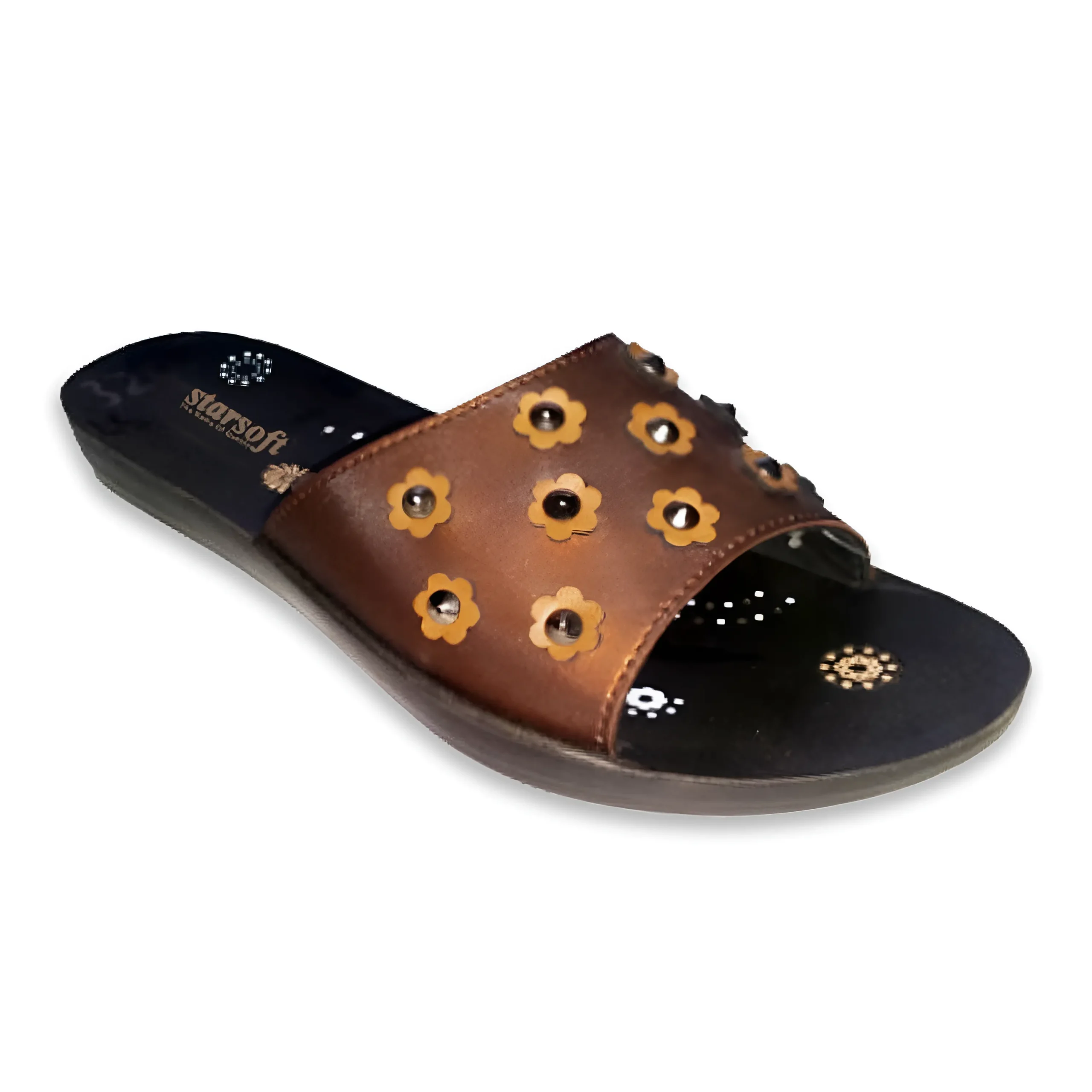 & Free ShippingStylish brown ladies slide slipper featuring small floral decorations with shiny studs on the strap. Comfortable, lightweight, and perfect for daily casual wear.