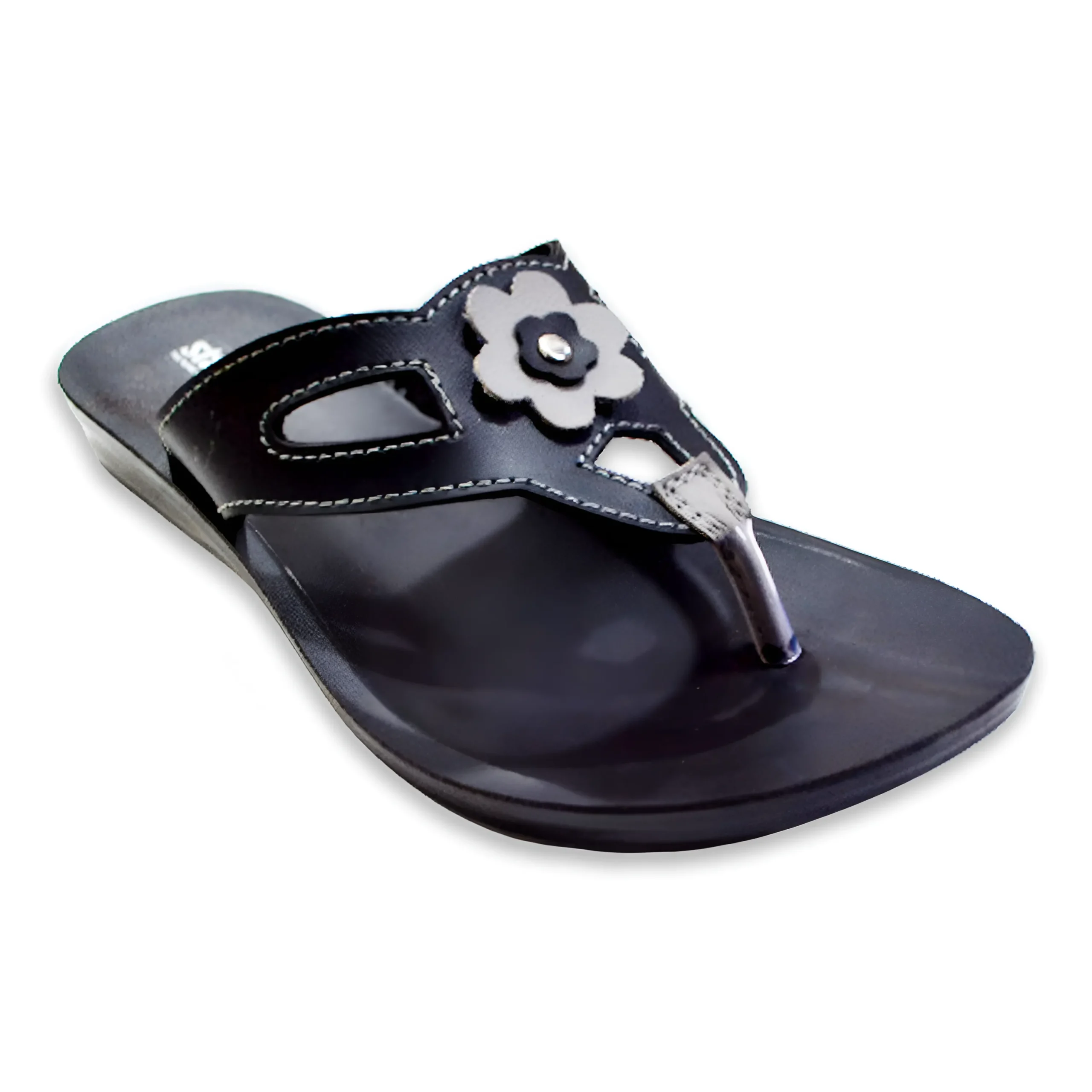 & Free ShippingElegant black ladies slipper with a stylish toe-post design and decorative flower detail on the strap. Lightweight sole and soft footbed provide comfortable support for everyday casual wear.